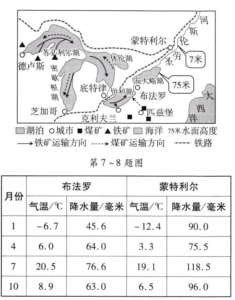 [2024·兰山一模]北美洲的五大湖是著名的淡水湖群,其水量约占世界淡水湖总量的1/5,有“北美地中海”之称,对经济发展起到了重要作用。读五大湖地区简图和两城市气候资料表,完成7~8题。