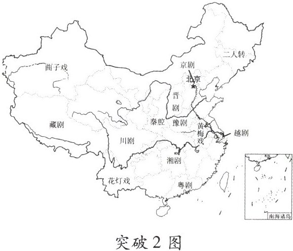 突破2 [2024·新疆]“小舞台,大智慧”,中国戏曲源远流长,种类繁多,百花齐放。读我国部分地方戏曲分布图,完成1~2题。
