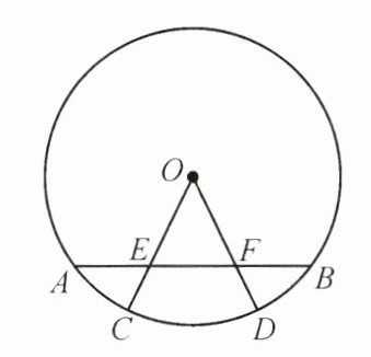17. 如图所示,$AB$是$\odot O$的弦,半径$OC$,$OD$分别交$AB$于点$E$,$F$,且$AE = BF$,请写出线段$OE$与$OF$的数量关系,并给予证明。