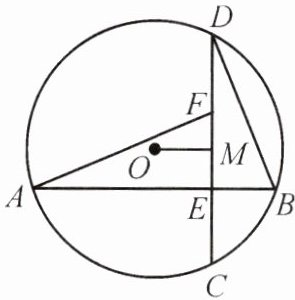 解:(1)连接OD,因为M是CD的中点,CD = 12,所以DM = $\frac{1}{2}$CD = 6,OM⊥CD,∠OMD = 90°。在Rt△OMD中,OD = $\sqrt{OM^{2}+DM^{2}}$,且OM = 3,所以OD = $\sqrt{3^{2}+6^{2}}$ = 3$\sqrt{5}$,即⊙O的半径为3$\sqrt{5}$。(2)连接AC,延长AF交BD于点G。因为AB⊥CD,CE = EF,所以AB是CF的垂直平分线。所以AF = AC,即△ACF是等腰三角形。因为CE = EF,所以∠FAE = ∠CAE。因为$\overset{\frown}{BC}$ = $\overset{\frown}{BC}$,所以∠CAE = ∠CDB。所以∠FAE = ∠CDB。又因为∠AFE = ∠DFG,所以∠AGD = ∠AEF = 90°。所以AF⊥BD。