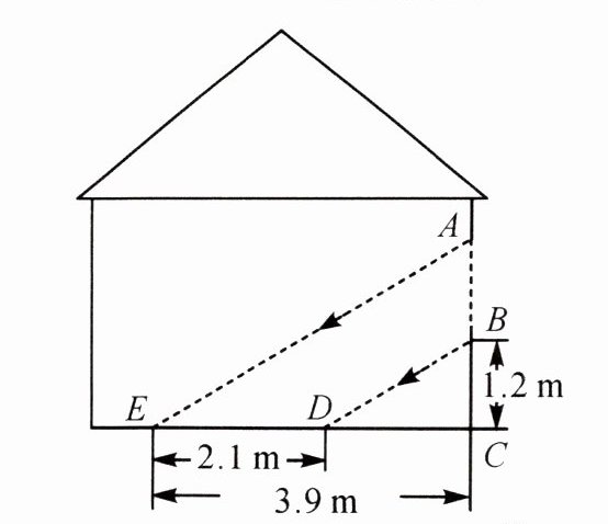 15. 如图,阳光通过窗口照到教室内,竖直窗框在地面上留下2.1 m长的影子,已知窗框的影子DE到窗下墙脚的距离CE=3.9 m,窗口底边离地面的距离BC=1.2 m. 则窗口的高度(即AB的值)为________m.