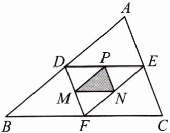 13. 如图,在$\triangle ABC$中,$D$,$E$,$F$分别为$AB$,$AC$,$BC$的中点,点$P$,$M$,$N$分别为$DE$,$DF$,$EF$的中点. 若随机向$\triangle ABC$内投一粒米,则米粒落在图中阴影部分的概率为________.
