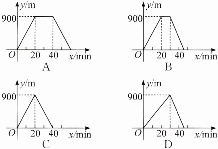 3. 小明的父亲从家出发,步行20 min到达离家900 m的书店,在书店看书10 min后,步行15 min返回家. 下列图中能表示小明的父亲离家的距离与时间的函数图象是 ( )