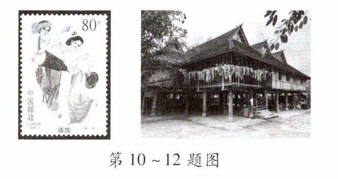 [2024.福山期末]“五十六个民族,五十六朵花”。我国各民族都有自己独特的文化特色。如图是一张我国少数民族主题邮票及邮票中民族的传统民居。据此,完成10~12题。
