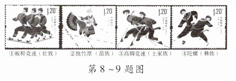 [2024.莱州期中]下图是第十一届少数民族传统体育运动会纪念邮票。读图,完成8~9题。