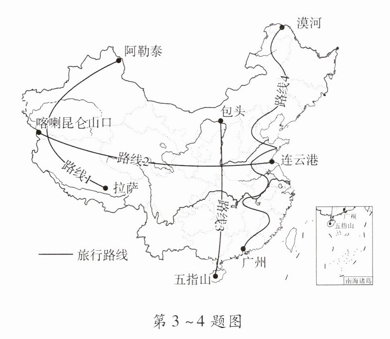 [2024·蓬莱期末]众多的“驴友”游遍大江南北,感受祖国锦绣山河。他们在网上发微博,分享沿途见闻。读“驴友”提示的旅行路线图(路线1:阿勒泰—拉萨;路线2:喀喇昆仑山口—连云港;路线3:包头—五指山;路线4:漠河—广州),完成3~4题。