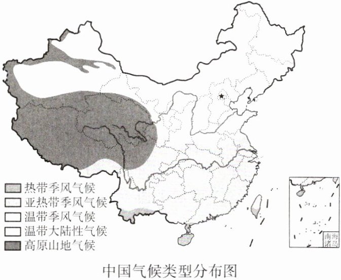 2. 我国的气候类型:中国东半部有大范围的季风气候,自南向北依次为热带季风气候、________气候、________气候;西北部大多为________气候;青藏高原为独特的________气候。