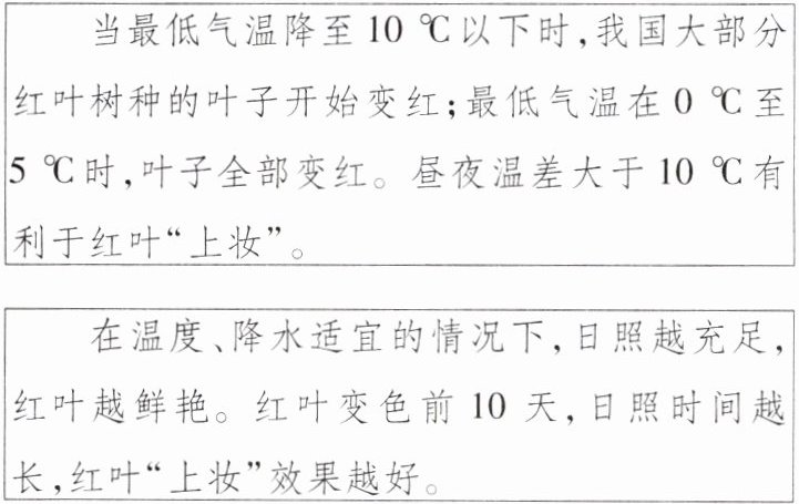 [2024.招远期中]又是一年红叶季!2023全新赏红叶地图出炉。树叶随着气温的下降而变红。下图为“我国部分红叶景区及最佳观赏期示意图”以及两条红叶“上妆密码解读”。读图,完成下列各题。
