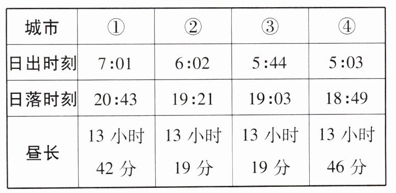 4.小明用表格统计四城市日出日落时刻的时候,发现截图上没有城市名称,他用序号①②③④进行了标注,并运用地球运动原理对各城市数据进行了比较(见下表),以下判断正确的是( )