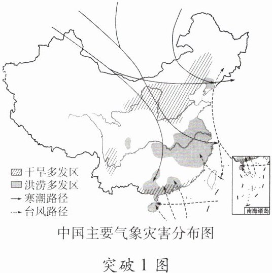 突破1[2023.临沂]2022年,我国自然灾害以洪涝、干旱、风雹和地震灾害为主,台风、冷冻和沙尘暴等灾害也有不同程度发生。如图为中国主要气象灾害分布图。据此,完成1~2题。