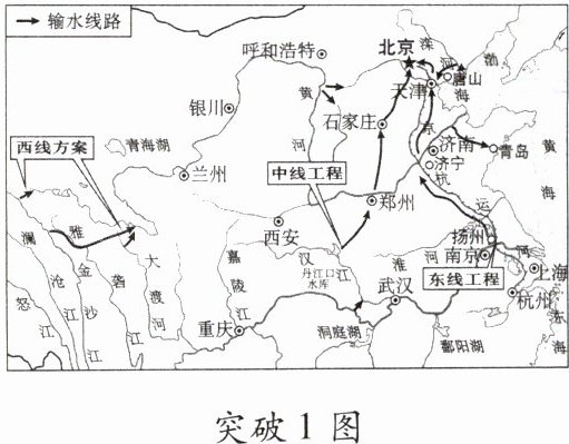 突破1[2024.苏州]自2014年12月27日至今,“南水”进京已近十年。北京推出阶梯水价,即居民用水价格=水费+水资源费+污水处理费。按年度用水量计算,划分为三档,水价分档递增。如图为南水北调部分工程示意图,据此,完成1~3题。