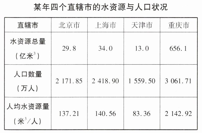 突破3[2024.福建]我国四个直辖市的水资源存在差异。读表完成1~2题。