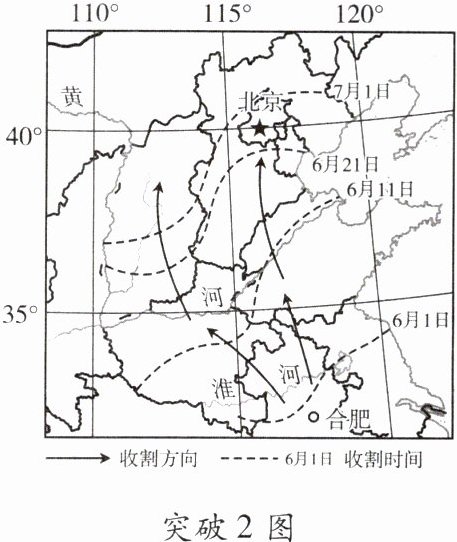 突破2[2024.安徽]春末夏初,我国某粮食主产区的作物自南向北渐次变成金黄色。驾驶收割机的农机手们从安徽省中部出发,带着乡村收获的喜悦,一路向北,描绘祖国丰收的画卷。下图示意该主产区粮食作物收割状况。