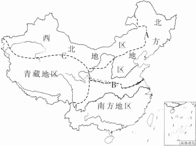 青藏地区和其他三区域的分界线与____的分界线相吻合。即以____山脉、祁连山脉和____山脉为界,界线两侧的差异主要表现在地势高低方面。所以确定界线C的主导因素是____