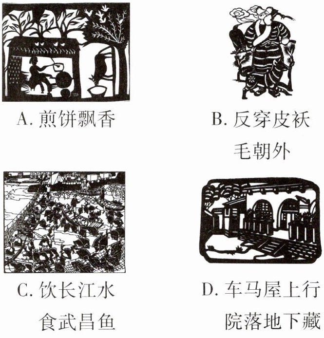 6. [2020.烟台]2020年春节前后,武汉发生新型冠状病毒肺炎疫情,小明的爸爸随山东省第一批医疗队紧急驰援湖北。小明心系湖北,上网查询相关信息,浏览到一些反映人们生活环境、民俗风情的剪纸图片。以下剪纸主题与湖北吻合的是 ( )