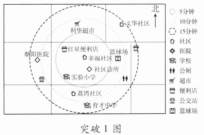 突破1 [2024.山西]“15分钟便民生活圈”是以社区为中心,市民步行直线距离仅需15分钟即可享受购物、社交、文化、休闲、医疗、健身、教育等多种便民服务。如图示意幸福社区15分钟便民生活图。据此,完成1~2题。