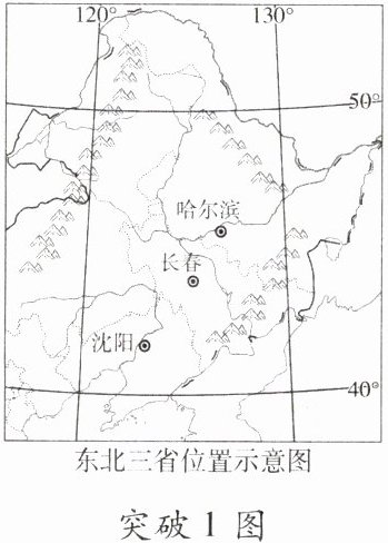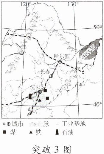 突破3 [2024.临沂]东北地区既是我国的“北大仓”,又是“新中国工业的摇篮”。如图为东北地区略图。据此,完成1~2题。