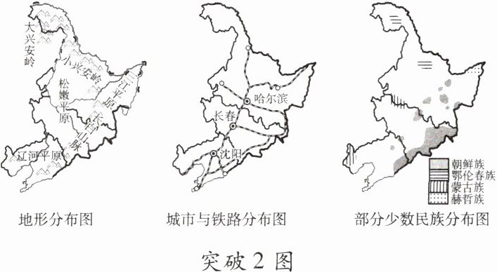 突破2 [2024.临沂二模]哈尔滨冰雪旅游2024年元旦“火出圈”,累计接待游客304.79万人次,实现旅游总收入59.14亿元。为迎接来自全国四面八方的旅客,鄂伦春族出山,赫哲族上岸!读东北地区地理事物分布图,完成1~2题。