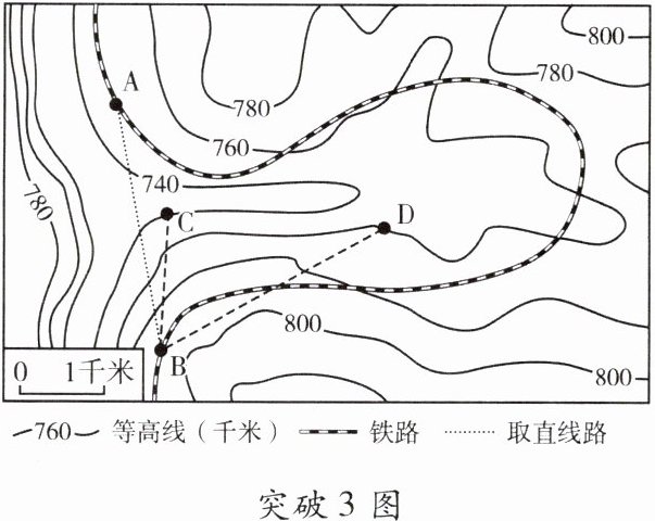 突破3 [2024.长春]如图为某地等高线地形图与铁路线分布图,AB两点图上直线距离约为3厘米,则两点的实地直线距离约为( )