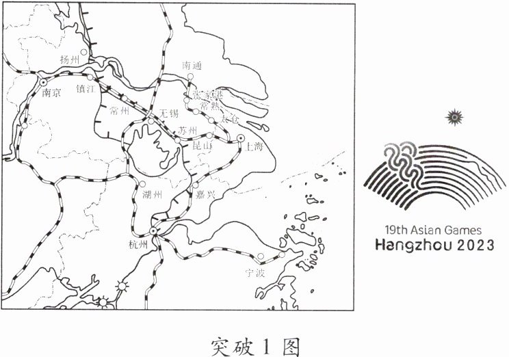 突破1 [2023.聊城模拟]第19届亚运会于2023年9月23日至10月8日在中国浙江省杭州市举行。杭州亚运会主题口号为“心心相融,@未来”,会徽由扇面、钱塘江、钱江潮头、赛道、互联网符号及象征亚奥理事会的太阳图形六个元素组成。据此,完成1~2题。