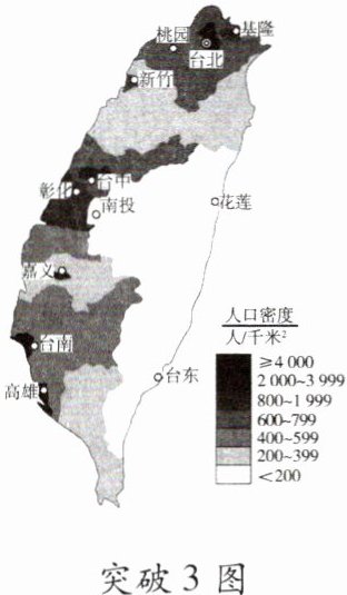 突破3[2024.江西]台湾与祖国大陆血脉相连。台湾省大部分居民的祖籍为福建和广东。图示意台湾岛人口分布。据此,完成1~3题。