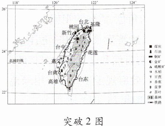 突破2[2024.新疆]台湾自古以来就是祖国不可分割的一部分。读台湾岛物产和城市分布图,完成1~2题。