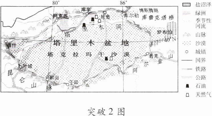 1.C 解析:塔里木盆地的油气资源主要集中在盆地边缘地区;环沙漠铁路的修建不只是为了运输油气资源,还为了加强区域间的联系;塔里木盆地的城镇、绿洲多沿盆地边缘分布;全年高温多雨是热带雨林气候的特征,塔里木盆地气候干旱。2.A