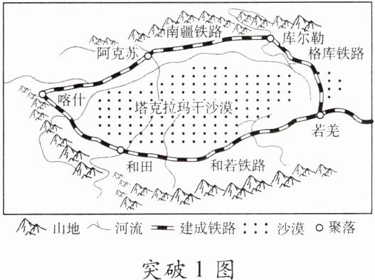 突破1 [2024.苏州]读新疆环塔里木盆地铁路(简称“环塔铁路”)示意图,完成1~2题。