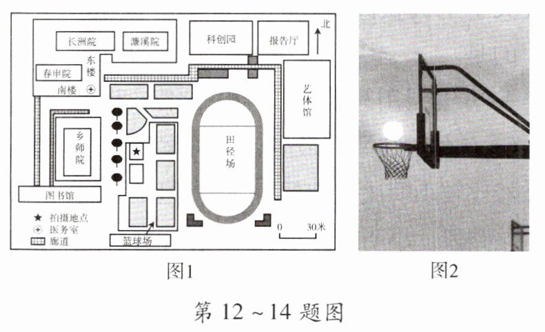 [2024·烟台期末]小明爱好摄影。图1为小明学校局部平面示意图,图2为小明在校园中拍摄的“太阳灌进篮筐”创意照片,据此,完成12~14题。