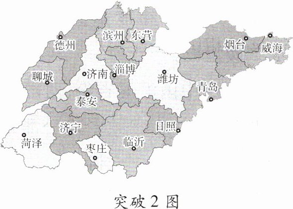 突破2 [2023.聊城]2023年,凭借特色烧烤火爆“出圈”的山东淄博(36°48′N,118°02′E)成为网红城市。读山东省政区示意图,完成1~2题。