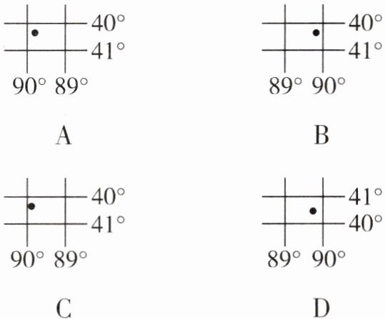 5. [2024·牡丹江]我国古代楼兰文明早已消逝在浩瀚的荒漠中。经考证,楼兰古城位于(40°29′55″N,89°55′22″E)。下列经纬网图能够表示其大致位置的是( )