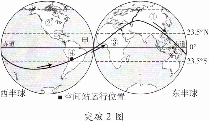 突破2 [2024.新疆]天宫空间站是我国自主研发距地400千米~500千米绕地飞行的空间站系统。读天宫空间站某时刻运行位置和轨迹图,完成1~2题。
