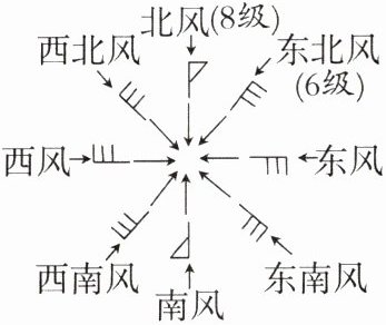 (2)风向是指风的来向,有“东、南、西、北”以及“东南、西南、西北、东北”一共八个基本方向。风向为“北”,说明风来自北方。风力是风强弱的级别,共分18级,级数越大,风力越强。