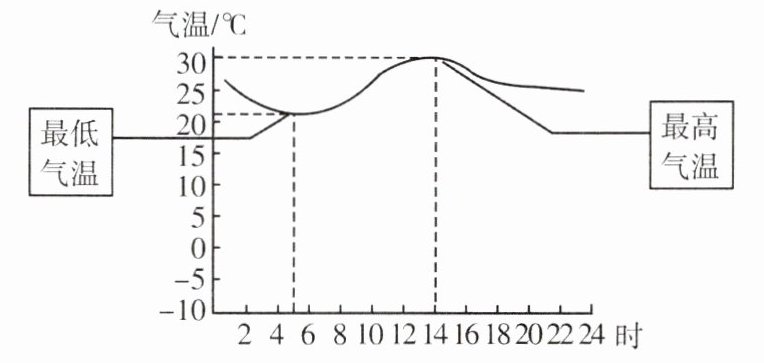 | ________ = 一天中最高气温 - 一天中最低气温 | (图中气温日较差约为:30℃ - 21℃ = 9℃) |