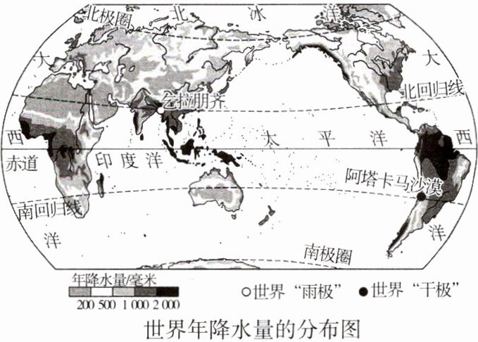 2. 世界的“雨极”:印度东北部的乞拉朋齐。世界的“干极”:智利北部的阿塔卡马沙漠。