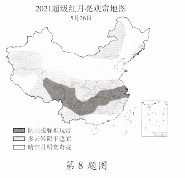 [2021.烟台]2021年5月26日,月全食+超级红月亮天象在全球多地上演,中国处于月食可见区。据此,完成7~8题。