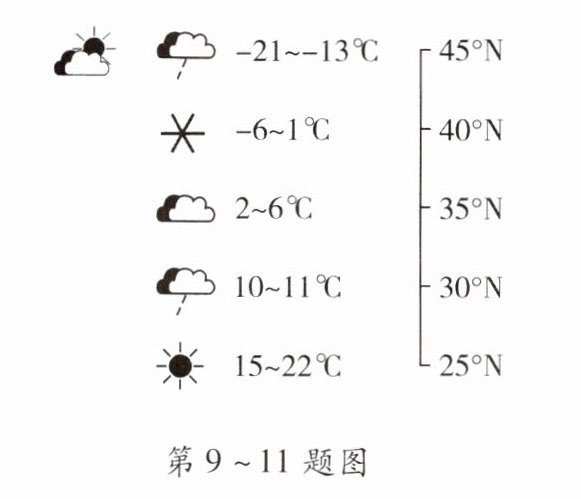 [2023.烟台期中]2021年12月24日前后,我国东部地区自北向南经历了一次降温天气过程。下图是该日我国东部部分城市天气状况及相应纬度位置示意图。读图,完成9~11题。