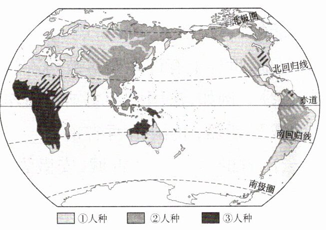 |②______人种|______洲东部、北美洲北部、南美洲西北部|