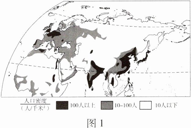 突破1 [2024.青海]人口密度能够反映人口分布的疏密程度,它是指一定时期内,单位面积土地上居住的人口数。分析一个大洲、地区人口密度往往要从自然环境和历史、社会经济条件等方面入手。如图为世界局部人口密度分布图,读图,完成1~2题。