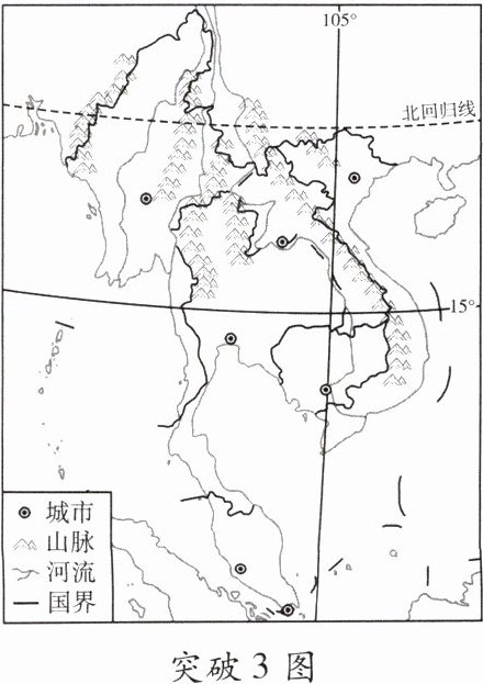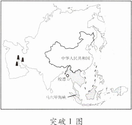 突破1[2024.云南]东南亚地理位置重要,与我国山水相连,贸易往来密切。近年来,我国与缅甸共同推进皎漂港的建设运营。读东南亚位置示意图,完成1~2题。