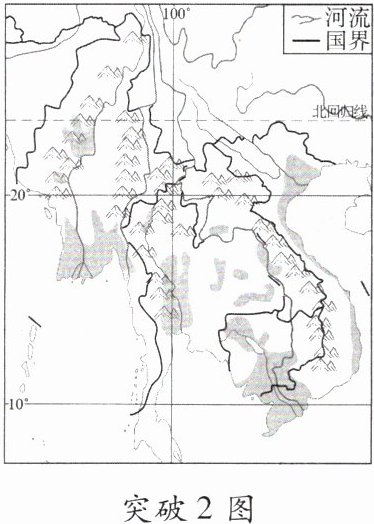 突破3[2023.云南]中南半岛因在中国以南而得名,与我国山水相连。读中南半岛示意图,完成1~2题。