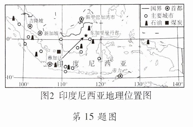 (3)由中国修建的雅万高铁是印度尼西亚雅加达至万隆的高速铁路,建成通车后,通行时间将由现在的3个多小时缩短至40分钟。该项目是中国“一带一路”标志性项目。雅万高铁的走向为________________,结合地图分析雅万高铁在修建过程中需要克服的不利地理条件有哪些?