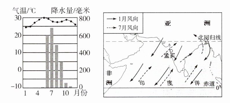 |影响|从陆地吹向海洋,气流干燥,降水稀少|从____洋上带来了丰富的水汽,降水丰沛|
