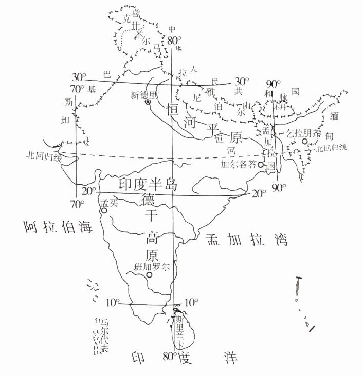 热 北温 孟加拉湾 阿拉伯海 印度洋 中国 缅甸 巴基斯坦 斯里兰卡 马尔代夫 高原 德干高原