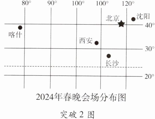突破2 [2024·达州]“爆竹声中一岁除,春风送暖入屠苏”。2月9日20时,中央广播电视总台《2024年春节联欢晚会》如约与海内外观众相见。五大会场各具特色,新春的欢乐喜气扑面而来。结合图文材料,判断下列说法正确的是 ( )