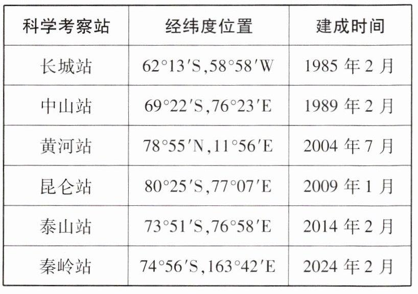 突破1 [2024·山西]20世纪80年代以来,我国在极地科学考察中取得了举世瞩目的成就。下表为我国极地科学考察站的相关信息。我国纬度最高的极地科学考察站是 ( )