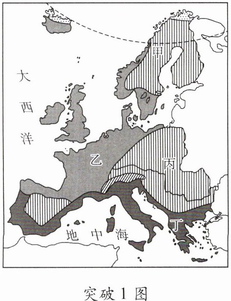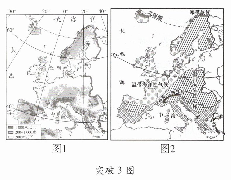 突破3 [2024·长春]欧洲西部畜牧业发达,英国是著名的畜牧业大国。图1为欧洲西部地形图,图2为欧洲西部气候类型分布图。据此,完成1~3题。