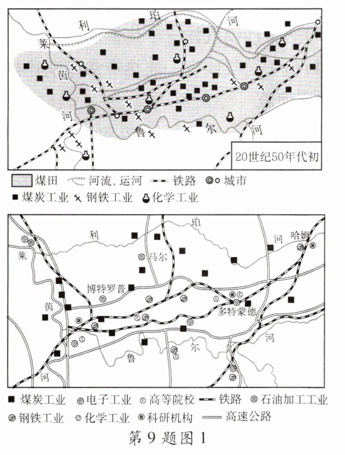 材料一 鲁尔工业区以采煤工业起家,随着煤炭的综合利用,促进了电力、钢铁、化学和机械制造业的发展。在经历了辉煌之后,鲁尔区陆续出现各种问题。经过综合整治,如今的鲁尔区已成为地区经济新的发动机。