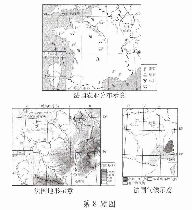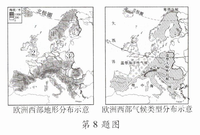 8.[2024.烟台节选]为了认识农业的重要性,小明以欧洲西部为例探究环境对农业发展的影响。根据资料完成探究问题