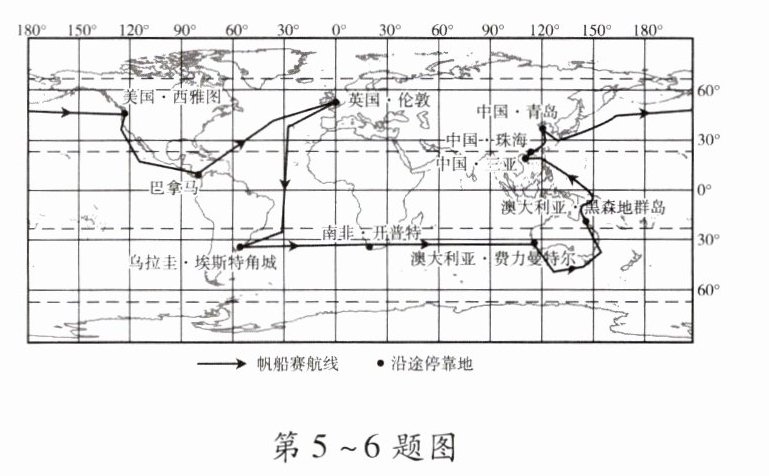 [2024·牟平期末]克利伯2019 - 2020环球帆船赛在英国伦敦起航,11支赛队开启环球之旅。下图为此次帆船赛航线图。读图,完成5~6题。